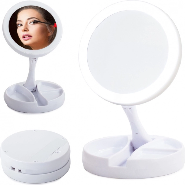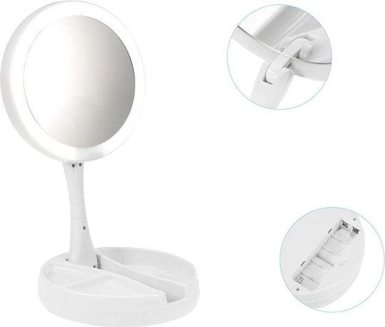 Stabilno stojalo z predalčki za drobnarije poskrbi, da so čopiči, pinceta ali šminka vedno pri roki. Konstrukcija s nagibanjem/vrtenjem za 180° olajša nastavitev idealnega kota. Napajanje je prilagodljivo: baterije 4× AA ali prek 5 V Micro USB – popolno za domačo toaletno mizico in potovanja.
