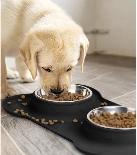 Privoščite svojemu ljubljenčku udobno in čisto hranjenje. Dve posodi iz nerjavečega jekla s prostornino 2 × 450 ml sta vstavljeni v prožno silikonsko podlogo, ki ujame razlito vodo in razsuto hrano. Podloga v obliki kosti ima povišan rob in protizdrsno obdelavo, zato ostane na mestu tudi ob navdušenem obedovanju.