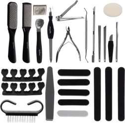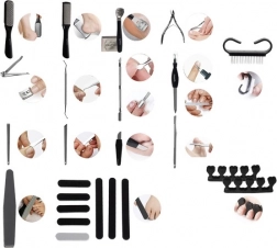 Set vsebuje vse potrebno za odstranjevanje trde kože, oblikovanje in poliranje nohtov, nego obnohtne kožice ter nežno dodelavo detajlov. Eleganten etui ohranja vse komponente pregledno na enem mestu – idealno za dom, salon in potovanja.