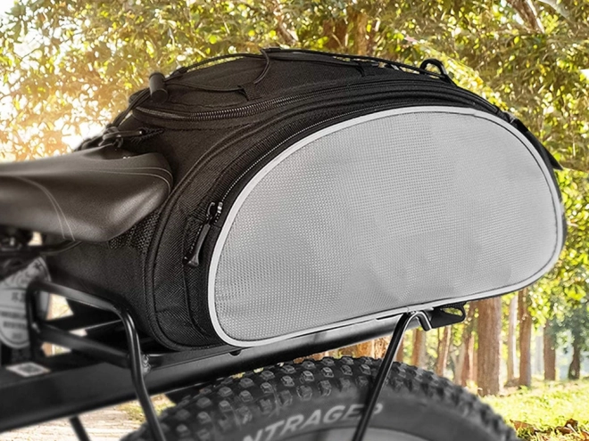 Gumijasti zamaški na pokrovu omogočajo varno shranjevanje jakne ali steklenice, medtem ko odsevni trakovi povečujejo vašo varnost na cestah. Univerzalen dizajn se prilega večini kolesarskih nosilcev, montaža z nastavljivimi zaponkami pa je hitra in lahka.