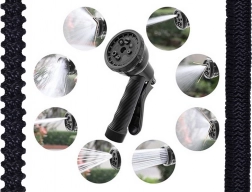 Del paketa je tudi večfunkcijska brizgalna pištola z osmimi razprševalnimi načini. Enostavno zaklepanje sprožilca s kovinskim kavljem vam omogoča gladko uporabo vode, brez potrebe po držanju stisnjene ročice. Ergonomska, nedrseča ročica zagotavlja udobno in varno držanje.