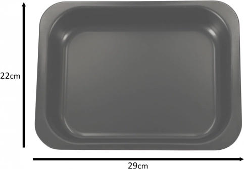 Notranje mere 29 × 22 × 6 cm (zunanje približno 32 × 24 × 6 cm) ustrezajo večini pečic in pokrijejo širok nabor sladkih in slanih receptov.