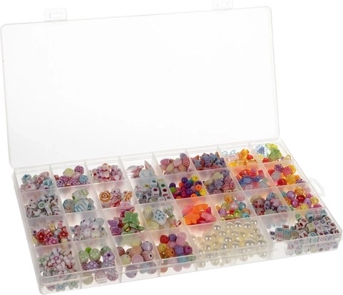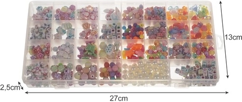 - XXL komplet v organizatorju - 900 pisanih komponent omogoča ustvarjanje različnih vrst nakita. Del kompleta so tudi obročke, vrvica, zaponke in povezave.