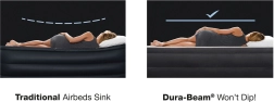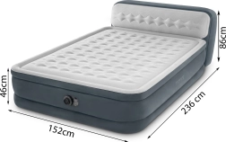 Dvoslojna napihljiva postelja INTEX s tehnologijo Dura-Beam Fiber-Tech ponuja veliko ležalno površino, integrirano vzglavje in vgrajeno električno črpalko za hitro napihovanje in izpihovanje. Višina od tal 46 cm ter površina iz mehkega velurja zagotavljata udobje, stabilnost in čist videz. Največja nosilnost 272 kg omogoča zanesljivo spanje za dva.
