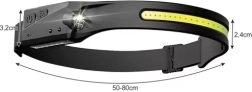 Brezstično upravljanje prek senzorja gibanja boste cenili z umazanimi ali zasedenimi rokami. Vgrajena baterija 1200 mAh se udobno polni prek USB‑C in zagotavlja 3–8 ur delovanja glede na izbran način. Trpežna silikonska konstrukcija z IPX4, mehka penasta podloga in nastavljiv trak 50–80 cm zagotavljajo udobje tako otrokom kot odraslim.