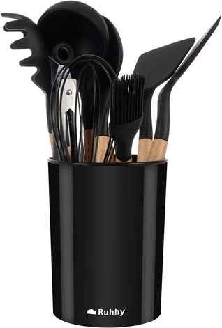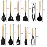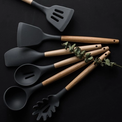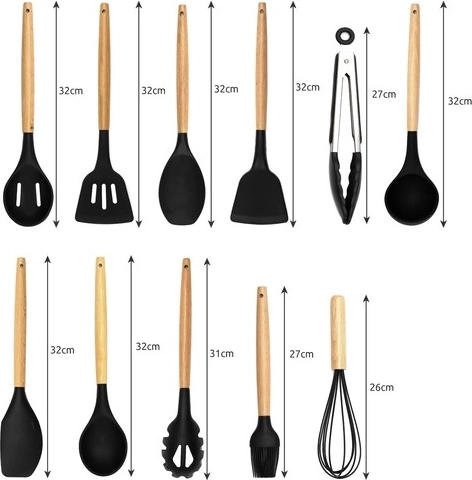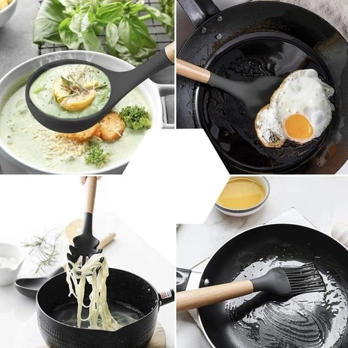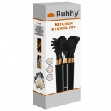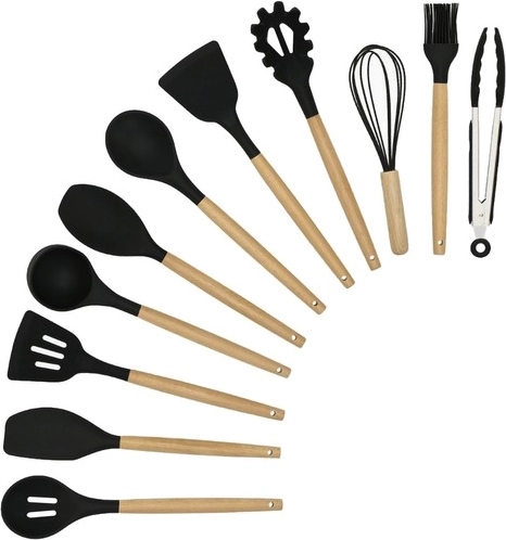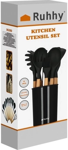 Set kuhinjskih pripomočkov znamke Ruhhy vsebuje 12 različnih orodij, vključno s spatulo, zajemalko in krtačko, vsi z ergonomskimi lesenimi ročaji in trpežnimi silikonskimi glavami. Ta orodja so odporna na visoke temperature, enostavna za čiščenje in preprečujejo praske na vašem kuhinjskem posodju.