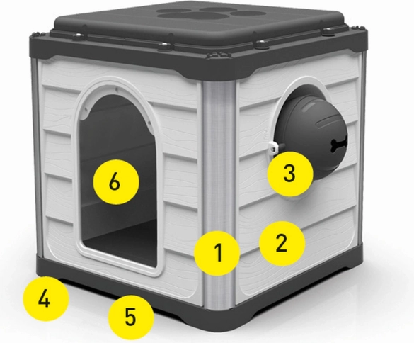 Zahvaljujoč modularnemu sistemu je sestavljena iz 6 glavnih delov: stena z vhodom, stena z dozirnikom hrane, dve polni steni ter dva dela dna/strehe z drenažnimi žlebovi za enostavno čiščenje. Sestavljanje je hitro, brez orodja, zato je hiška idealna za domačo uporabo in potovanja.