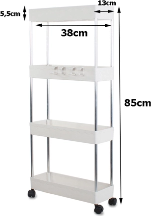 Omarica je zasnovana za učinkovito uporabo prostora v vašem domu. Štiri police nudijo dovolj prostora za shranjevanje toaletnih potrebščin v kopalnici ali živil v kuhinji. Zaradi koles je enostavno prenosljiva in večnamenska, tako da jo lahko prilagodite svojim potrebam.