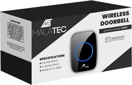 Brezžični zvonec Malatec je sodobna naprava, ki vam ponuja zanesljivo obvestitev obiskovalcev zaradi širokega dosega do 300 metrov. Ima eleganten črn dizajn in je izdelan iz trpežnega ABS plastike. Zaradi vodotesne zaščite (IP44) je odporen tudi proti dežju in snegu.