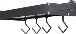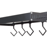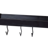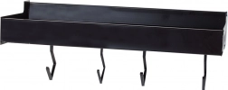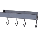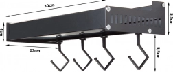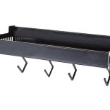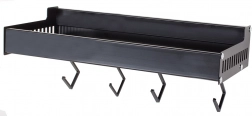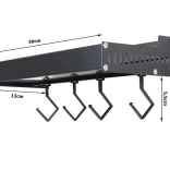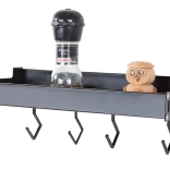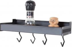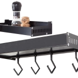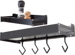 Ta stenska polica združuje minimalistični videz z največjo funkcionalnostjo. Prašno lakiran aluminij je odporen na vlago in korozijo, zato je idealen za kuhinjo in kopalnico. Odstranljivi kavlji omogočajo obešanje krp, zajemalk ali ključev, medtem ko zgornji odlagalni del varno drži začimbe, posodice ali kozmetiko.