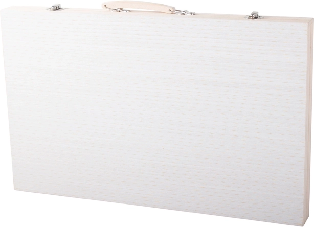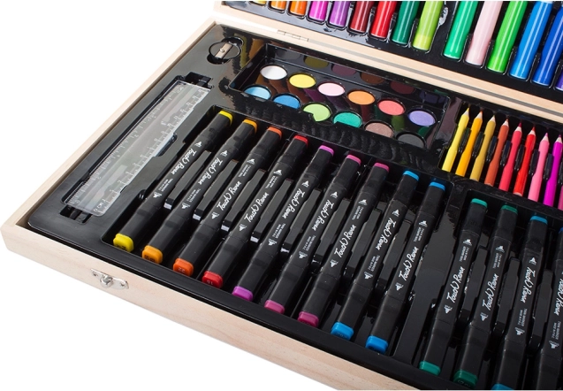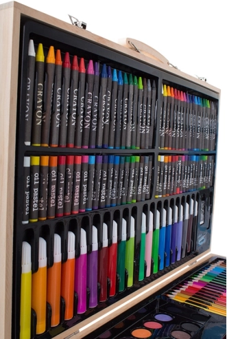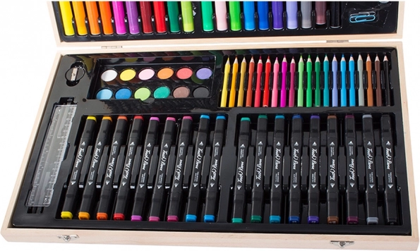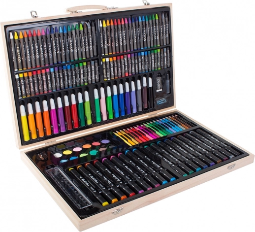Set je skrbno organiziran v trpežnem lesenem kovčku, kar zagotavlja enostavno prenašanje in organizacijo. Vsako orodje ima v setu svoj prostor, kar pomeni, da ne boste nikoli izgubili svoje najljubše barvice. Po končanem ustvarjanju vse preprosto pospravite in shranite v kovček.