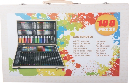 Set vsebuje 188 različnih kosov, ki ponujajo obsežno paleto orodij za ustvarjalno izražanje in razvoj domišljije.