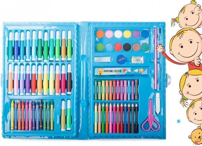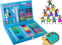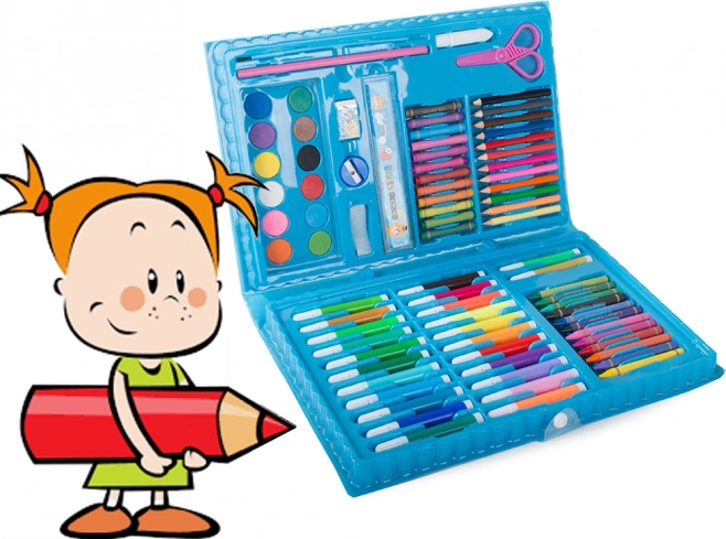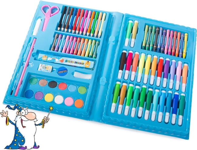Barvice, flomastri, oljni pasteli in akvarelne barve, dopolnjeni s čopičem, paleto, šilčkom, radirko in drugimi pripomočki – idealen začetek za otroke in začetnike.