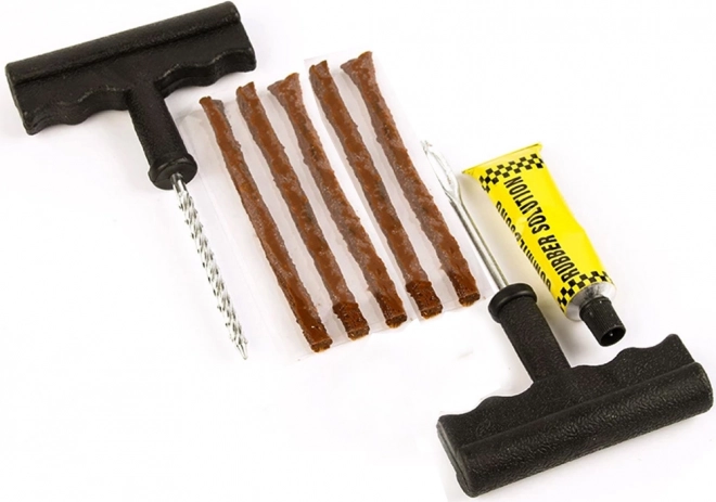 - Razširjalo z ročajem, šilo z ročajem, 5× vulkanizacijska vrvica, lepilo
