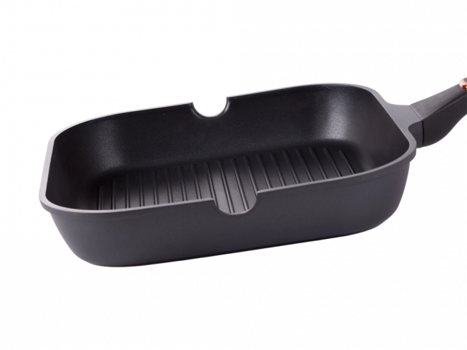 Vzdržljiva žarna ponev 28 cm iz tlačno litega aluminija z neprijemljivo površino za preprosto kuhanje in čiščenje. Primerna za indukcijo, plin, steklokeramiko in elektriko. Rebrasta površina ustvari učinek žara, obojestranska izlivnika olajšata izlivanje, ergonomski ročaj pa zagotavlja varen oprijem.
