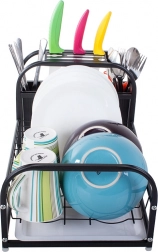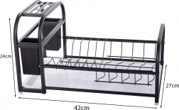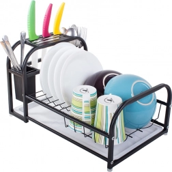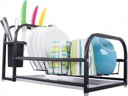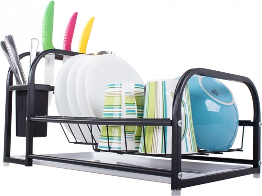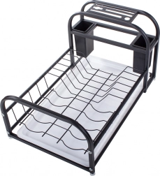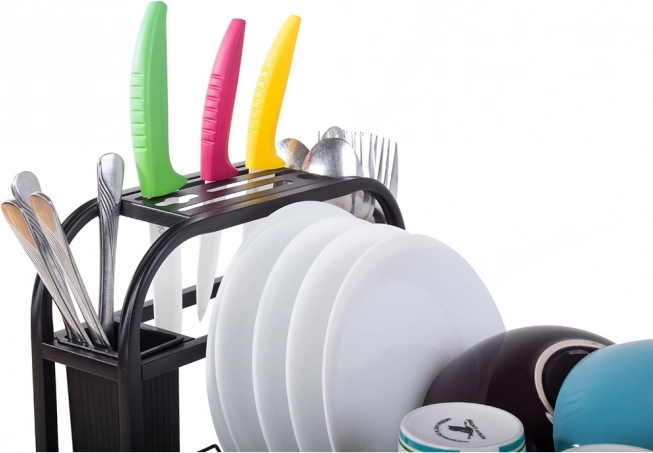 Ta sodoben odkapnik za posodo združuje trdno kovino s prašnim premazom in vzdržljive plastične komponente. Je odporen proti vlagi in poškodbam, zato je idealen za vsakodnevno uporabo v živahni kuhinji. Loft dizajn v elegantni črni barvi se zlahka ujema z vsakim interierjem in postane funkcionalen okras delovne površine.