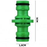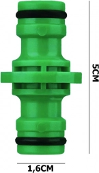 Ta univerzalni hitri spoj je zasnovan za hitro povezovanje dveh vrtnih cevi brez orodja. Zeleno ohišje s profilirano površino zagotavlja zanesljiv oprijem, kakovostni O-tesnilni obroči pa poskrbijo za tesen in neprepusten spoj.