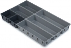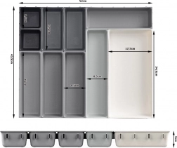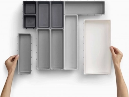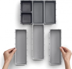 Komplet vsebuje 10 posodic različnih velikosti, ki jih preprosto povežete z vgrajenimi kljukami. Zahvaljujoč kompaktnim meram se odlično prilega večini standardnih predalov in ustvari pregleden sistem za pribor, nože, metlice, lupilce ter tudi pisarniške ali ustvarjalne drobnarije.