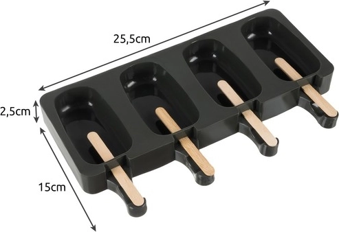 Pripravite domače lučke točno po svojem okusu s tem praktičnim silikonskim modelom s štirimi odprtinami in paketom 50 lesenih palčk. Prožen silikon zagotavlja enostavno odstranjevanje, preprosto čiščenje pa pospeši pripravo naslednje runde. Prostornina 4 × 80 ml je idealna za sokove, jogurte in miksano sadje.