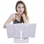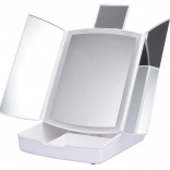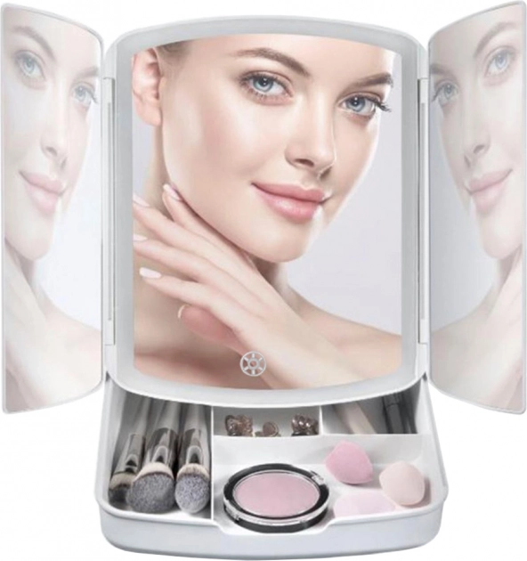 Stranska krilca razširijo vidni kot, podstavek s predalčki pa ohranja kozmetične dodatke pregledno pri roki – idealno za dom in potovanja.
