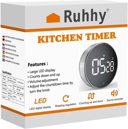 Praktični digitalni timer RUHHY z velikim LED zaslonom, magnetnim pritrjevanjem in funkcijo štoparice olajša kuhanje, trening in igre. Ponuja nastavljivo glasnost, natančno odštevanje do 99 min 55 s in enostavno upravljanje z enim dotikom.