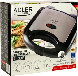 Uživajte v hitrih zajtrkih in večernih prigrizkih z aparatom za sendviče ADLER AD 3015. Kompakten aparat z neprijemljivimi ploščami pripravi popolno zapečene trikotne toaste brez prijemanja. Svetlobne kontrolke vas vodijo od segrevanja do trenutka, ko je naprava pripravljena za uporabo.