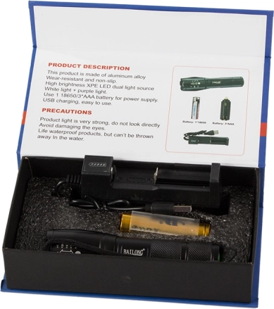 Dobavljena je v elegantni embalaži, idealni za darilo. Komplet vključuje polnilne baterije, adapter za AAA-baterije in drugo uporabno dodatno opremo.