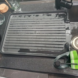 Posebej oblikovan pladenj z rebrasto površino in stranskim odtokom vodi vodo neposredno v korito. Delovna površina tako ostane suha in čista.