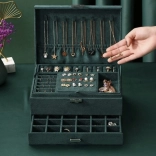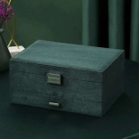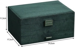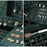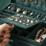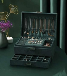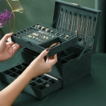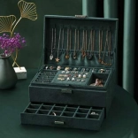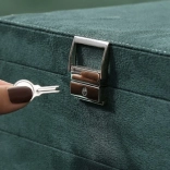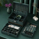 Ta prostoren kovček je prav tako zaščiten z odpornimi materiali, ki nudijo zaščito pred poškodbami, udarci in prahom. Njegov eleganten dizajn s srebrnimi detajli daje klasičen videz in estetsko privlačnost, zaradi česar vaš nakit izgleda čudovito, kamor koli ga postavite.