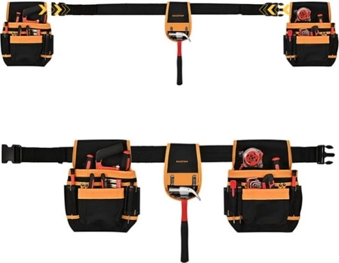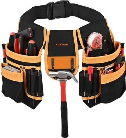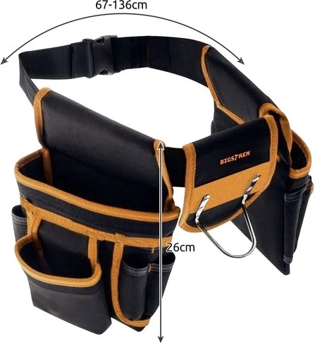 Orodni pas Bigstren je opremljen z 22 žepi, vključno z dvojimi zankami in držalom za kladivo, kar omogoča varno shranjevanje in prenašanje različnih orodij kot so izvijači, ključi, klešče, merilni trakovi in celo električna orodja.