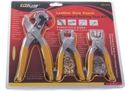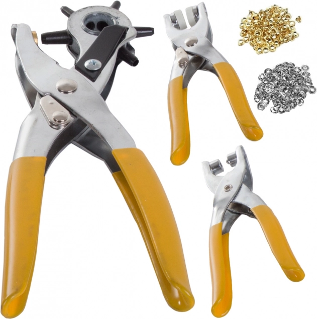 Ta set vključuje tri orodja za obdelavo usnja in dodatke v obliki 100 kosov netov in 100 kosov napenjalnikov. Orodja so narejena iz trdnega jekla, ki je odporen proti deformacijam, kar zagotavlja njihovo dolgo življenjsko dobo.