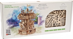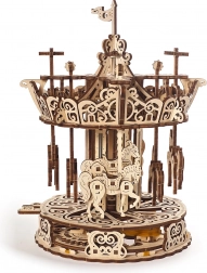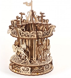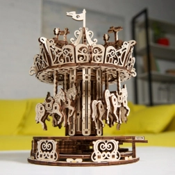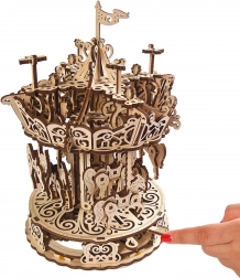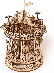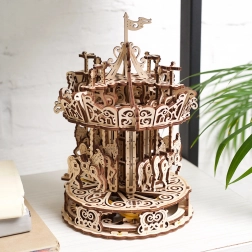 Privoščite si eleganten vrtiljak iz kakovostne vezane plošče, ki združuje nostalgijo s pametno mehaniko. Zahvaljujoč gumijastemu navijalnemu pogonu se osrednji steber in strešica vrtita v nasprotnih smereh, kar ustvarja optično iluzijo velike hitrosti. Konjički se gladko dvigajo in spuščajo, nad vrtiljakom pa krožijo drobne ptice – vse to je lepo vidno zaradi odprte zasnove.