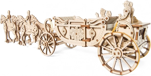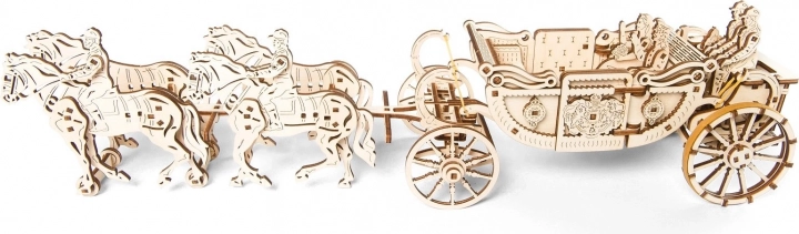 Sestavite ikonični model, navdihnjen z britansko »State Landau« – mehansko leseno kočijo s štirivprego, ki po navijanju prevozi do 4 metre. Komplet vsebuje 290 natančno izrezanih delov, odpirajoča se vrata, zamenljive figurice in realistično vzmetenje kočije za gladko vožnjo. Idealno za oboževalce znamke UGEARS, modelarje in kot dizajnersko dekoracijo.