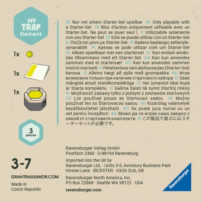 Dodatek GraviTrax Junior Past vnese v otroške steze element presenečenja. Kroglica v dodatku izgine in se znova pojavi na nižji ravni, kar spodbuja eksperimentiranje, načrtovanje in veselje do odkrivanja. Združljiv z vsemi elementi sistema GRAVITRAX JUNIOR.
