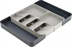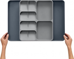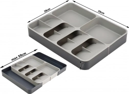 Organizator za kuhinjski predal je zasnovan tako, da maksimizira prostor in zagotovi pregledno ureditev vaših priborov in kuhinjskih orodij. S svojo razširljivo strukturo se prilagaja različnim velikostim predalov.