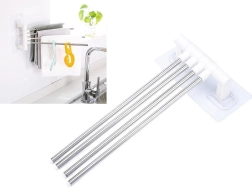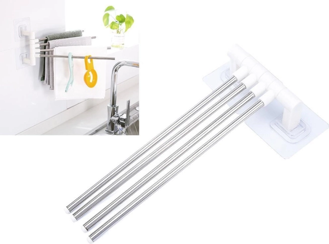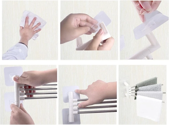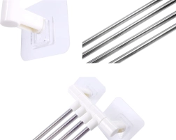 Montaža je hitra in čista – brez vrtanja. Močna samolepilna površina drži na gladkih podlagah, zato ne poškodujete ploščic. Idealno za kopalnico, kuhinjo ali pralnico, kjer boste cenili prihranek prostora in enostaven dostop do brisač.