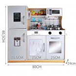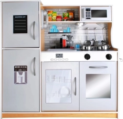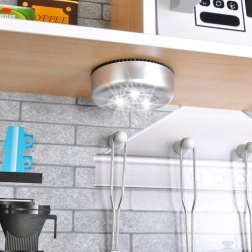 Otrokom privoščite lastno moderno kuhinjo s številnimi realističnimi elementi. LED osvetlitev lahko namestite pod omarico, v omarico ali v “pečico” in ustvarite pristno atmosfero. Ob obračanju gumbov kuhalnih plošč se zasliši značilen “klik”, kar igri doda nov razsežnost.