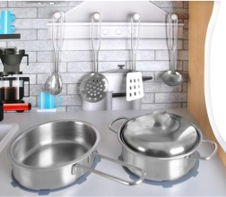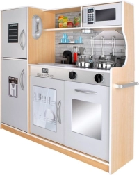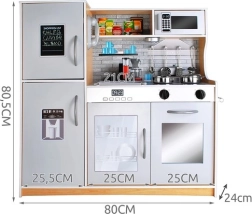 Kuhinja je izdelana iz kakovostnega lesa, zato je stabilna, trpežna in varna. Priložen je bogat kovinski komplet dodatkov – lonec, ponev, pokrovka in 4 kuhinjska orodja – ter odstranljiv pomivalni korito za enostavno “pomivanje” posode. Nevjpadljiv dizajn in barve so primerni tako za deklice kot dečke.