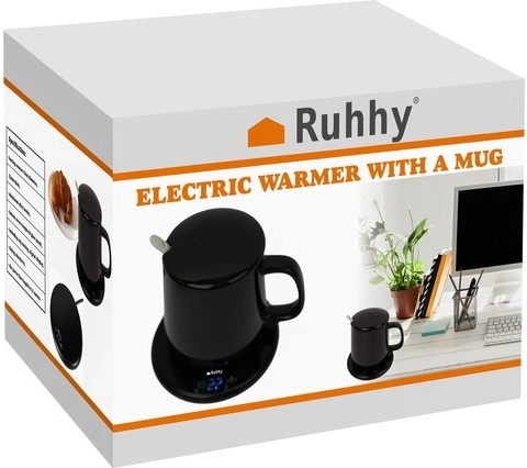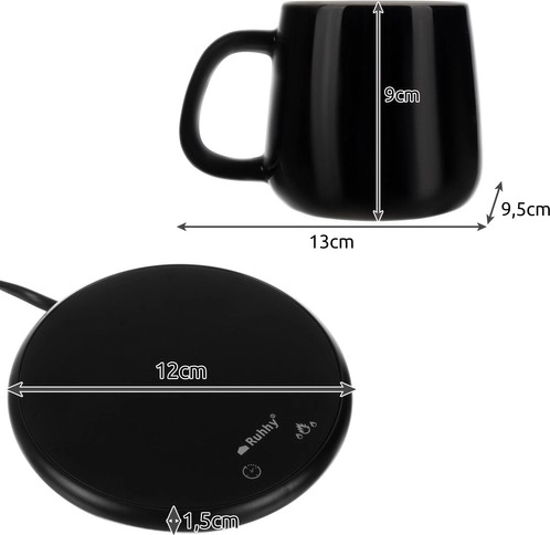 SPECIFIKACIJA- barva: črna + bela; material skodelice, pokrovčka in žličke: keramika; material podstavka: kaljeno steklo + aluminijeva zlitina; vodoodpornost: da; časovnik: da; 2 programa ogrevanja: 1: 40 °C, 2: 60 °C; nazivna frekvenca: 50–60 Hz; prostornina skodelice: 400 ml; dimenzije skodelice: 13 x 9,5 x 9 cm; dimenzije grelnika: 12 x 1,5 cm; moč: 18 W; napetost: 220 V; dolžina kabla: 130 cm; teža: 627 g; teža z embalažo: 865 g.