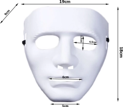 Zaradi kompaktnih dimenzij 19 × 18 × 9 cm je maska enostavno prenosna in pripravljena dopolniti vaš kostum za noč čarovnic ali grozljiv kostum. Minimalistična bela barva omogoča preprosto ujemanje z različnimi dodatki in oblačili.