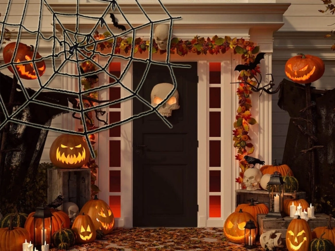 Velika črna pajčevina v hipu spremeni verando ali vhodna vrata v strašljivo sceno. Idealna za pozdravljanje obiskovalcev in okrasitev doma.
