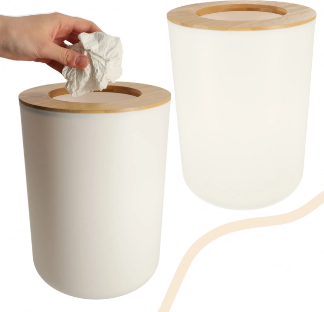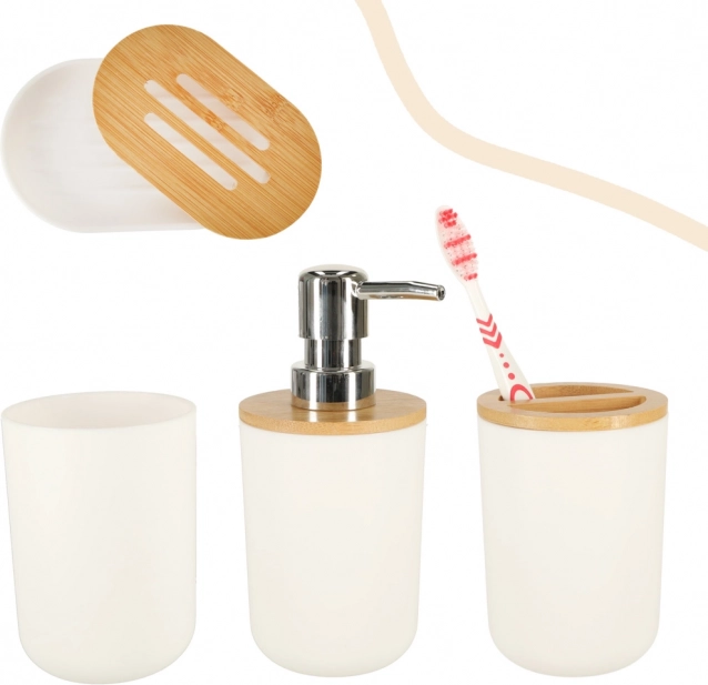 Eleganten kopalniški set v beli barvi z naravnimi bambusovimi elementi prinaša slog in red v vsako kopalnico. V pakiranju najdete vse potrebno za vsakodnevno higieno: podstavek za milo, dozirnik mila, lonček, stojalo za ščetke, WC ščetko s posodo in koš za smeti. Kombinacija plastike in lesa je odporna, preprosta za čiščenje in odlično dopolnjuje moderen interier.