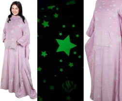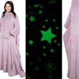 Uživajte v maksimalnem udobju s to mehko flisasto odejo z rokavi, ki sije v temi. Idealna za sprostitev ob TV, branje ali delo na prenosniku – prostorni rokavi zagotavljajo svobodo gibanja, topel flis pa prijetno greje.