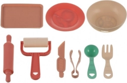 Set vključuje varni nož, vilice, žlico, skledo, pladenj in druga orodja, ki podpirajo ustvarjalno igro in pomagajo otrokom razviti njihovo domišljijo.