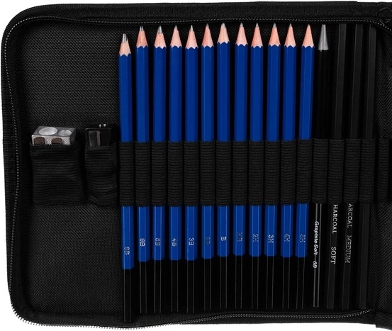 Celovit risarski komplet za skiciranje in senčenje v praktičnem etuiju z zadrgo. Vsebuje svinčnike različnih trdot, oglje, grafitne palčke, blendarje, radirke in šilčka – vse, kar potrebujete za natančen ris ali svobodno skico. Idealno za začetnike in napredne, z poudarkom na bogati opremi, urejenem shranjevanju in mobilnosti.