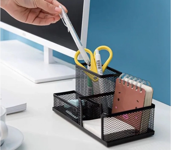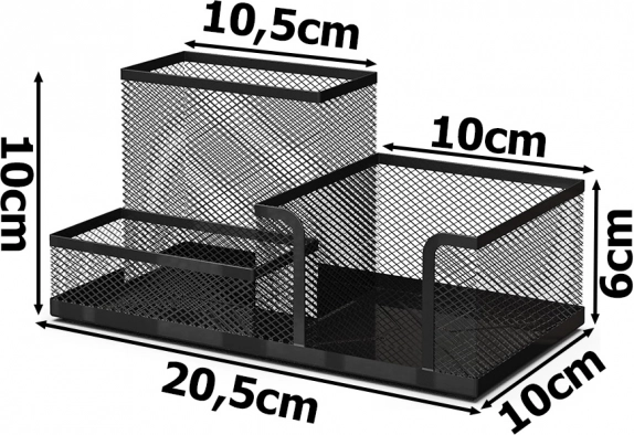 Odkrijte prednosti organizacije z našim črnim mrežnim namiznim organizatorjem. Njegova lahka kovinska konstrukcija je zasnovana tako, da vaša delovna površina ostane čista in učinkovita. Trije prostorni predelki pomagajo urediti vse vrste pisarniških potrebščin, kar vam omogoča, da se popolnoma osredotočite na delo in povečate produktivnost.