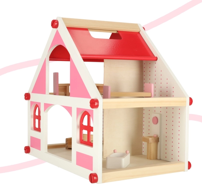 Prisrčna lesena hišica za punčke v rožnato-beli barvni kombinaciji prinaša ure kreativne igre. Ima dve nadstropji, odpirajoča se okna in vrata ter je priložena popolna garnitura pohištva (kad, kavč, naslanjač, dva stola, umivalnik, postelja in miza). Gladko brušen les zagotavlja varno igro, sestavljanje pa je preprosto zahvaljujoč priloženim vijakom in izvijaču.