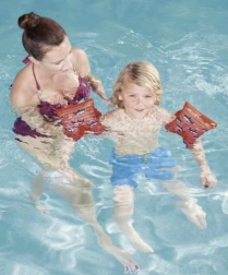 Varnostni ventili in nastavljivi pašček proti zdrsu držijo rokavčke na mestu, da ima otrok stabilno oporo v vodi.