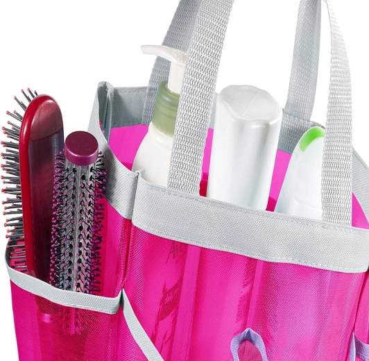 Prostorna in funkcionalna rožnata mrežasta plažna torba je idealna za plažo, igrišče ali sprehod. Zlahka sprejme debelejše plažne podloge, brisače in igrače. Zahvaljujoč mreži lahko mokre stvari prosto dihajo in tako hitreje sušijo. Praktični žepi omogočajo shranjevanje potrebščin in s tem preprečujejo dolgotrajno iskanje.