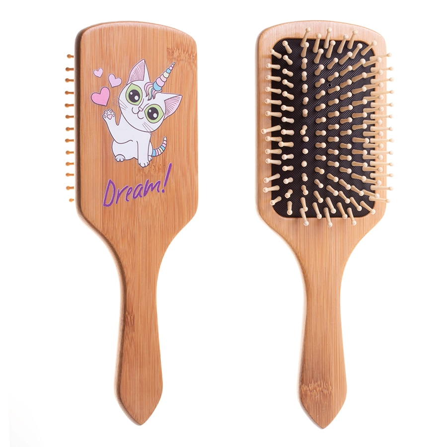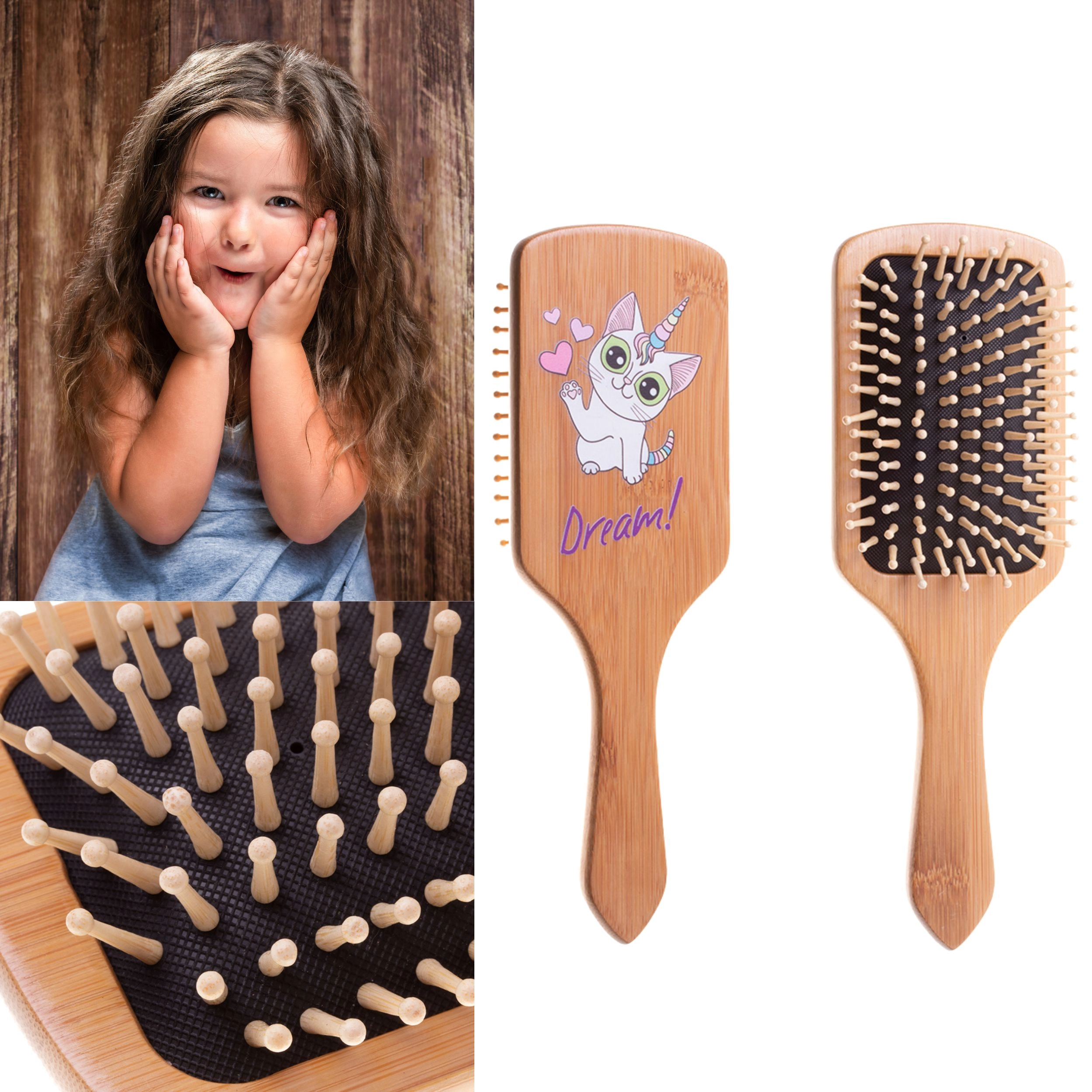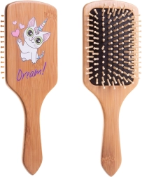 Zaradi naravnih materialov je krtača trpežna, lahka in primerna za ravne in valovite otroške lase. Zaobljene konice zatičev ščitijo občutljivo kožo in pomagajo enakomerno razporejati naravno maščobo po dolžini las za naraven sijaj. Dizajn s prisrčnim mačko‑samorogom in napisom »Dream!« spodbuja otroke k samostojnemu česanju.